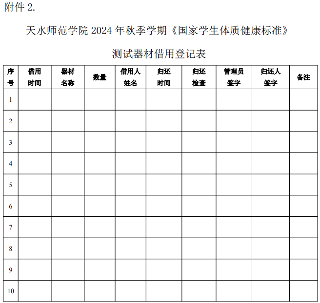 附件2.天水师范公司2024年秋季学期《国家员工体质健康标准》测试器材借用登记表